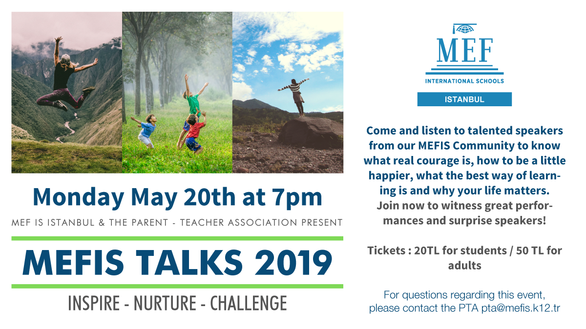 MEF International School, Istanbul Parent Teacher Association is hosting the inaugural MEF Talks on May 20. Inspiring speakers from the MEF community and two exciting performances will feature over the evening program starting at 19:00 in the large auditorium. Tickets are available at the school. Come join the MEF IS community and enjoy the evening.